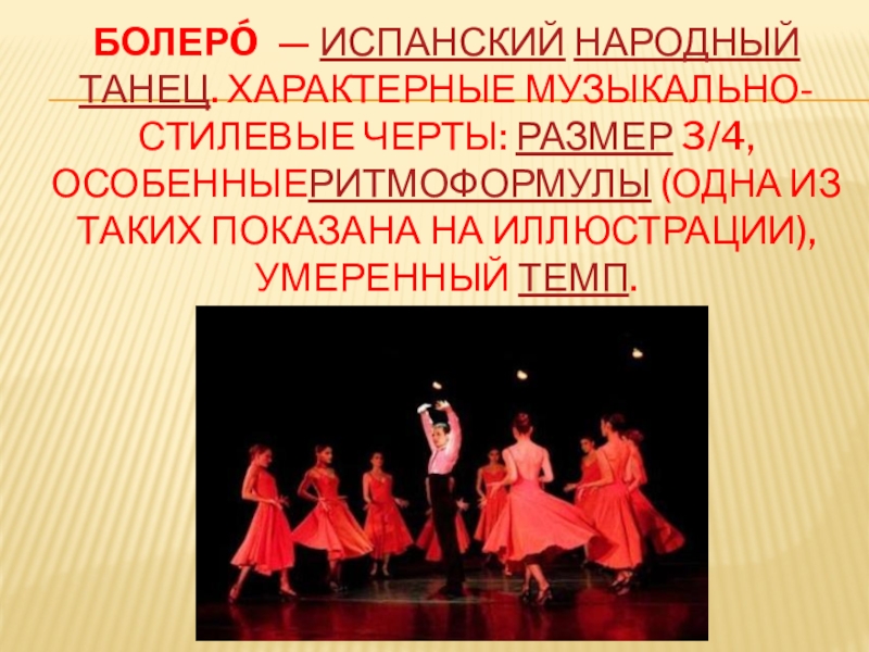 Слайд 3Болерó  — испанский народный танец. Характерные музыкально-стилевые черты: размер 3/4, особенныеритмоформулы (одна из таких показана на иллюстрации),