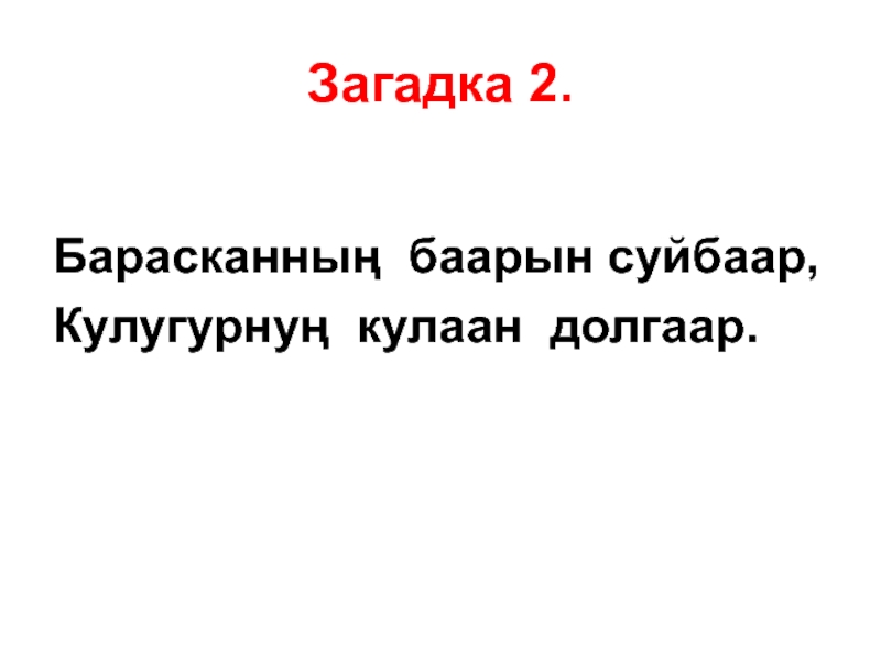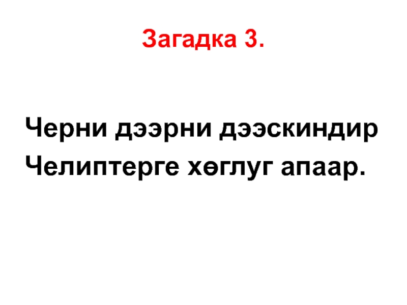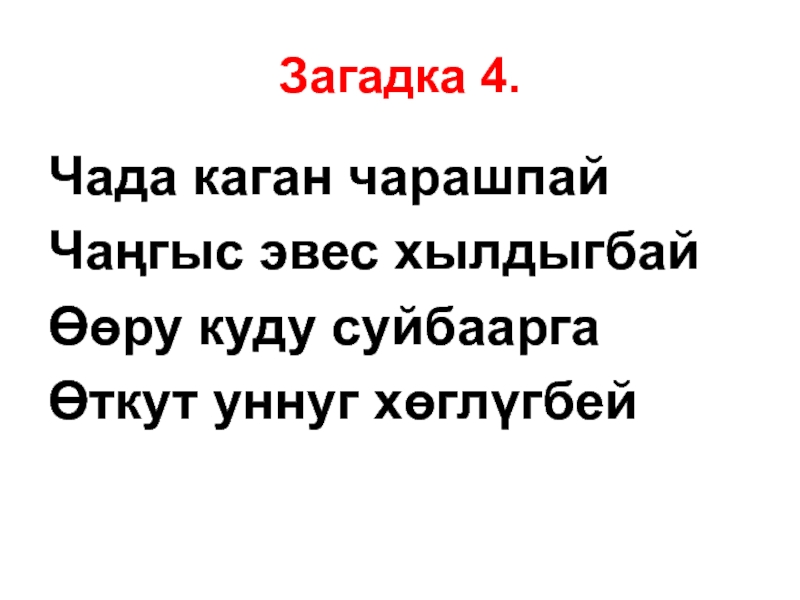 Загадка 4.Чада каган чарашпайЧаңгыс эвес хылдыгбайӨөру куду суйбааргаӨткут уннуг хөглγгбей