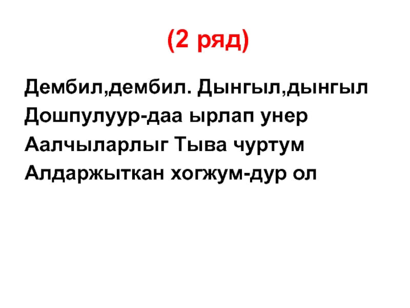 (2 ряд)Дембил,дембил. Дынгыл,дынгылДошпулуур-даа ырлап унерАалчыларлыг Тыва чуртумАлдаржыткан хогжум-дур ол