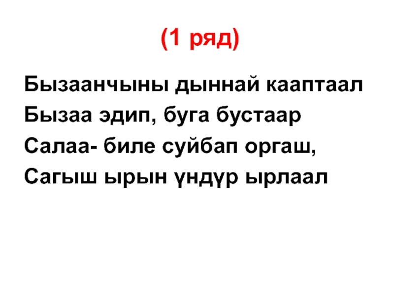 (1 ряд)Бызаанчыны дыннай кааптаалБызаа эдип, буга бустаарСалаа- биле суйбап оргаш,Сагыш ырын γндγр ырлаал