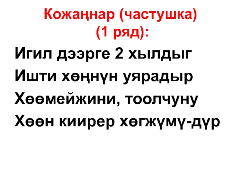 Кожаңнар (частушка)  (1 ряд):Игил дээрге 2 хылдыгИшти хөңнүн уярадырХөөмейжини, тоолчунуХөөн киирер хөгжүмү-дүр