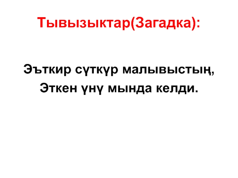 Тывызыктар(Загадка):Эъткир сγткγр малывыстың,Эткен γнγ мында келди.