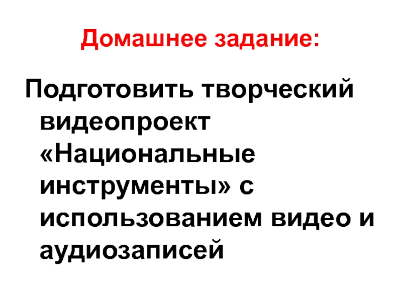 Домашнее задание:Подготовить творческий видеопроект «Национальные инструменты» с использованием видео и аудиозаписей