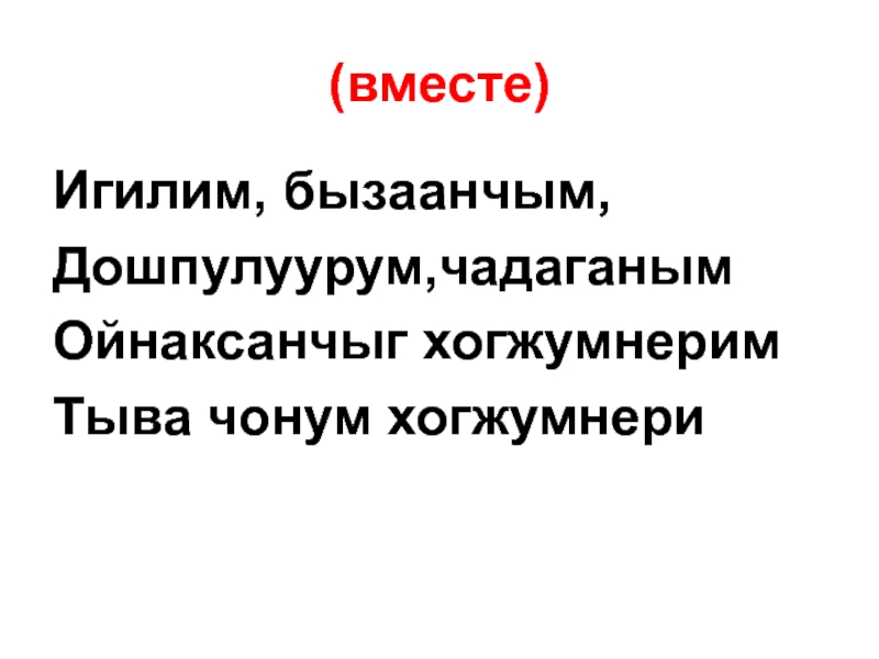 (вместе)Игилим, бызаанчым,Дошпулуурум,чадаганымОйнаксанчыг хогжумнеримТыва чонум хогжумнери