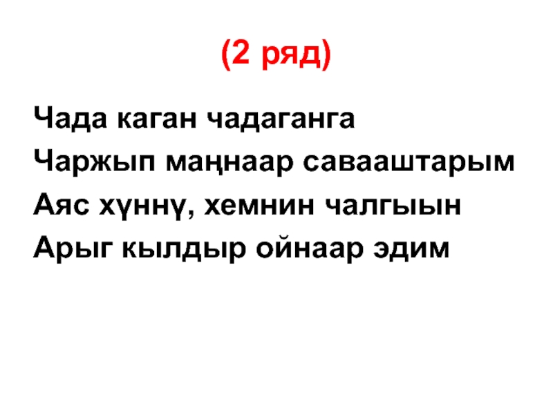 (2 ряд)Чада каган чадагангаЧаржып маңнаар савааштарымАяс хγннγ, хемнин чалгыынАрыг кылдыр ойнаар эдим