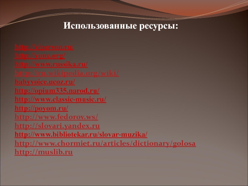 Использованные ресурсы: http://viperson.ru/http://yunc.org/http://www.russika.ru/http://ru.wikipedia.org/wiki/babyvoice.ucoz.ru/http://opium335.narod.ru/http://www.classic-music.ru/http://poyom.ru/http://www.fedorov.ws/http://slovari.yandex.ruhttp://www.bibliotekar.ru/slovar-muzika/http://www.chormiet.ru/articles/dictionary/golosahttp://muslib.ru