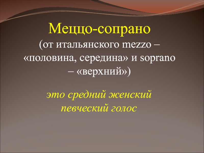 Слайд 19Меццо-сопрано (от итальянского mezzo – «половина, середина» и soprano – «верхний»)