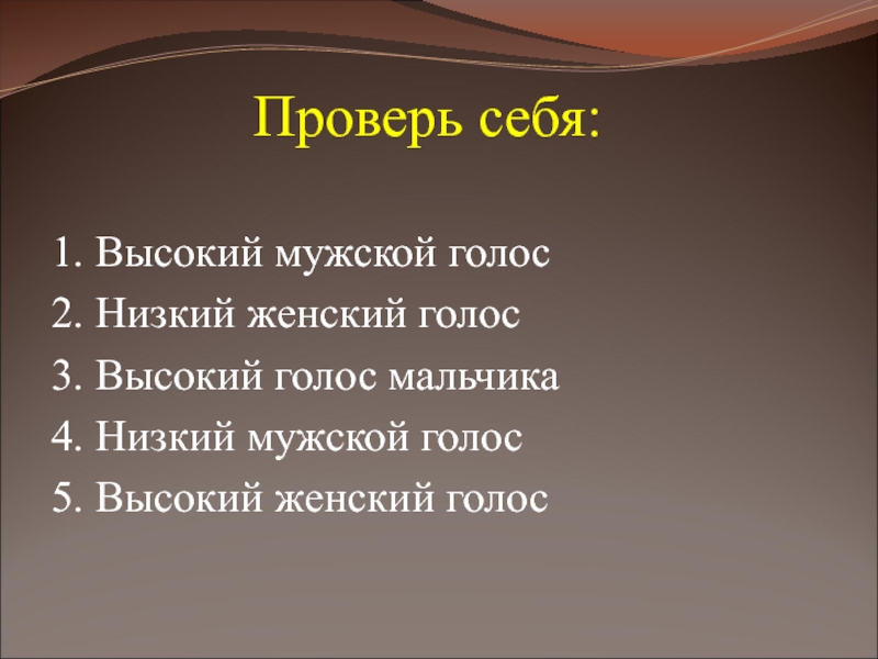 Проверь себя: 1. Высокий мужской голос2. Низкий женский голос3. Высокий голос мальчика4. Низкий мужской голос5. Высокий женский