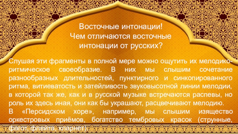 В «Персидском хоре», например, мы слышим изящество оркестровых приёмов, богатство тембровых красок (струнные, фагот, флейта, кларнет).