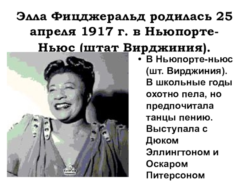 В Ньюпорте-ньюс (шт. Вирджиния). В школьные годы охотно пела, но предпочитала танцы пению. Выступала с Дюком Эллингтоном и Оскаром Питерсоном