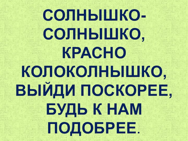 Слайд 16 СОЛНЫШКО- СОЛНЫШКО, КРАСНО КОЛОКОЛНЫШКО, ВЫЙДИ ПОСКОРЕЕ, БУДЬ К НАМ ПОДОБРЕЕ.