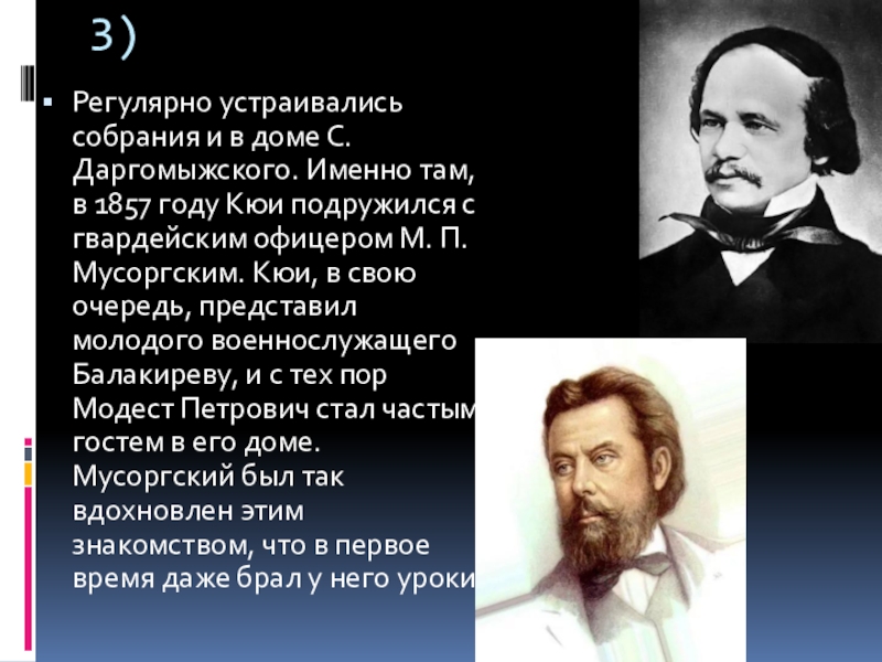 1857 году Кюи подружился с гвардейским офицером М. П. Мусоргским. Кюи, в свою очередь, представил молодого военнослужащего Балакиреву, и с тех пор Модест Петрович стал частым гостем в его доме. Мусоргский был так вдохновлен этим знакомством, что в первое время даже брал у него уроки.