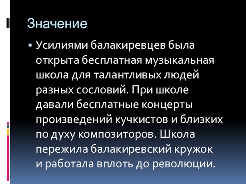 сословий. При школе давали бесплатные концерты произведений кучкистов и близких по духу композиторов. Школа пережила балакиревский кружок и работала вплоть до революции.