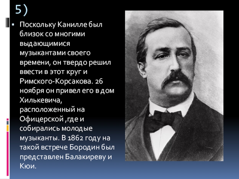 твердо решил ввести в этот круг и Римского-Корсакова. 26 ноября он привел его в дом Хилькевича, расположенный на Офицерской ,где и собирались молодые музыканты. В 1862 году на такой встрече Бородин был представлен Балакиреву и Кюи.