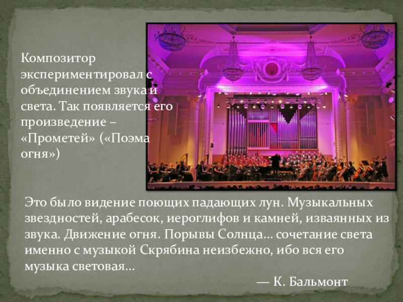 Это было видение поющих падающих лун. Музыкальных звездностей, арабесок, иероглифов и камней, изваянных из звука. Движение огня. Порывы Солнца… сочетание света именно с музыкой Скрябина неизбежно, ибо вся его музыка световая…