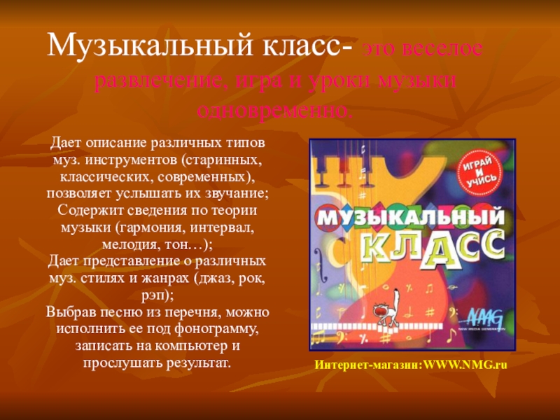 Слайд 18Музыкальный класс- это веселое развлечение, игра и уроки музыки одновременно.