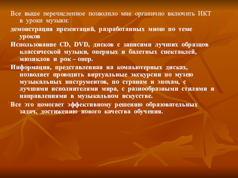 Слайд 14Все выше перечисленное позволило мне органично включить ИКТ в уроки музыки: