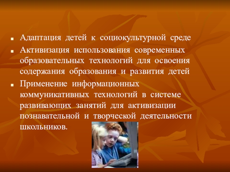 Применение информационных коммуникативных технологий в системе развивающих занятий для активизации познавательной и творческой деятельности школьников.