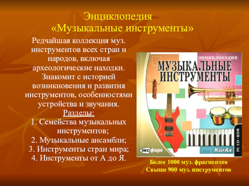 различных типов муз. инструментов (старинных, классических, современных), позволяет услышать их звучание;