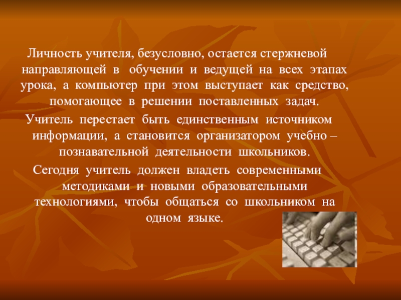 Слайд 4Личность учителя, безусловно, остается стержневой направляющей в обучении и ведущей