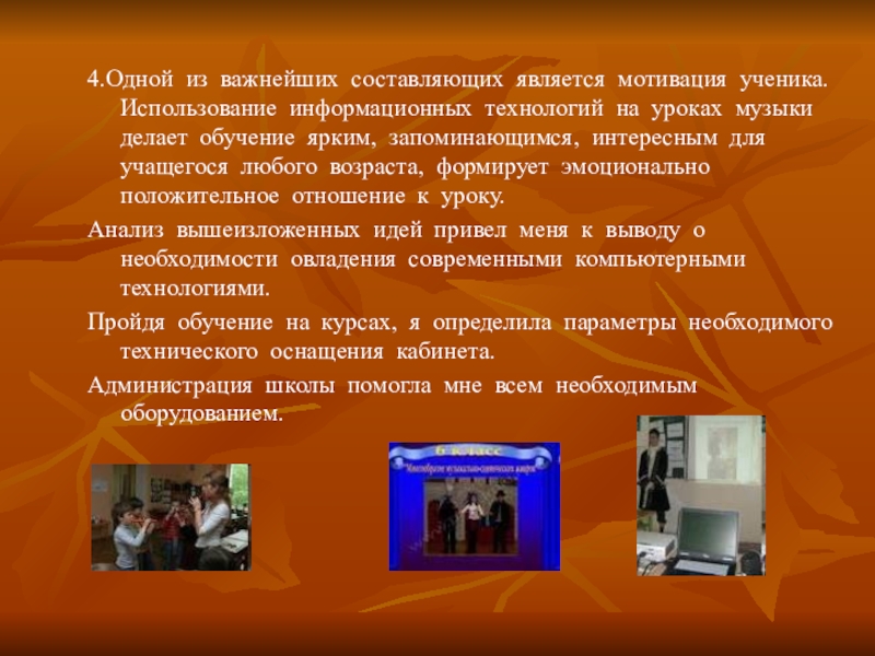 музыки, помимо традиционных ТСО, я активно использую новые информационные технологии - мультимедийные возможности, предоставляемые компьютером.
