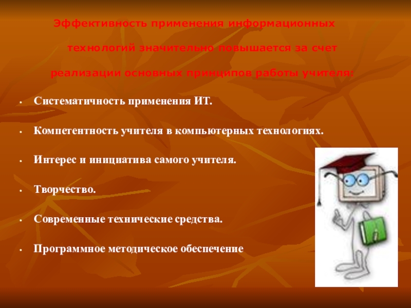 Слайд 7Эффективность применения информационных технологий значительно повышается за счет реализации основных принципов