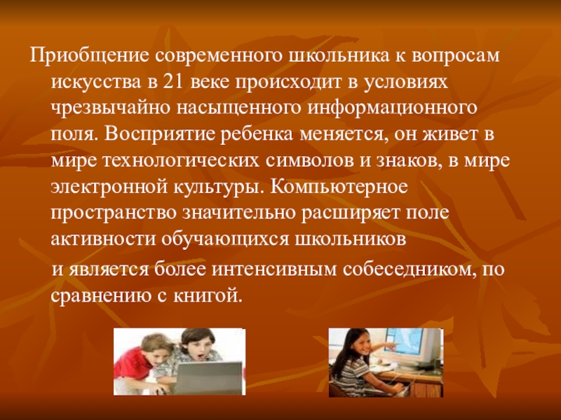 Слайд 3Приобщение современного школьника к вопросам искусства в 21 веке происходит в