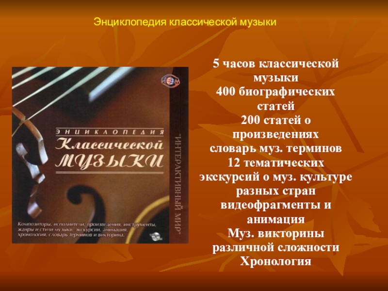 Информация, представленная на компьютерных дисках, позволяет проводить виртуальные экскурсии по музею музыкальных инструментов, по странам и эпохам, с лучшими исполнителями мира, с разнообразными стилями и направлениями в музыкальном искусстве.