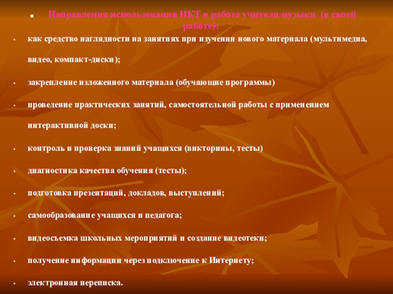 Слайд 13 Направления использования ИКТ в работе учителя музыки (в своей работе):