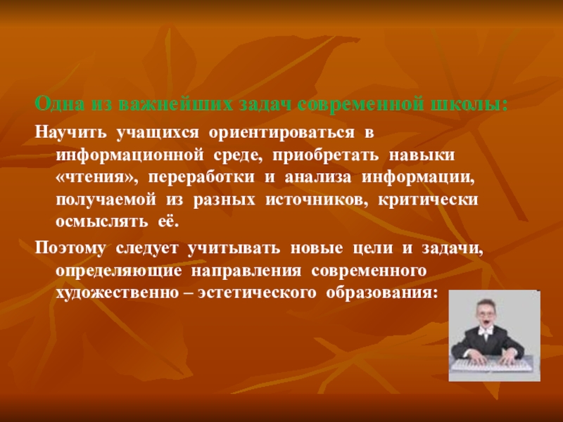 Слайд 10Размышляя о современном уроке музыки я определила для себя некоторые ведущие