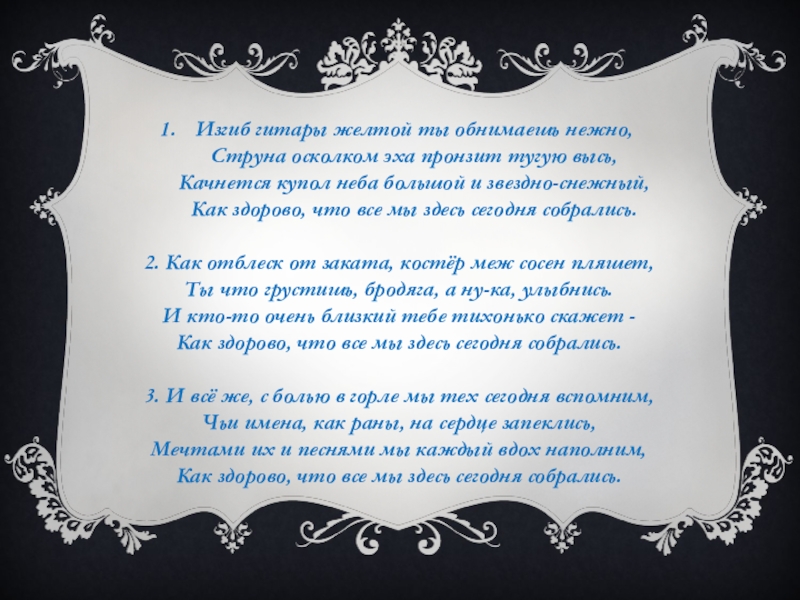 Слайд 21Изгиб гитары желтой ты обнимаешь нежно, Струна осколком эха пронзит тугую высь, Качнется