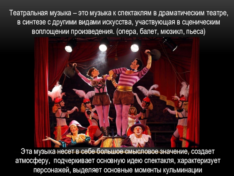 Эта музыка несет в себе большое смысловое значение, создает атмосферу, подчеркивает основную идею спектакля, характеризует персонажей, выделяет основные моменты кульминации