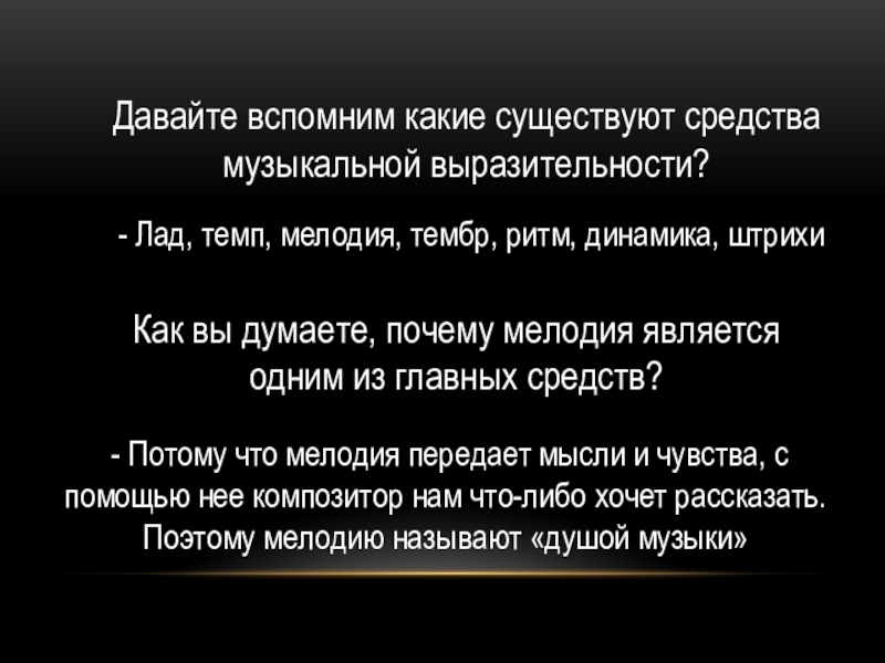 - Потому что мелодия передает мысли и чувства, с помощью нее композитор нам что-либо хочет рассказать. Поэтому мелодию называют «душой музыки»