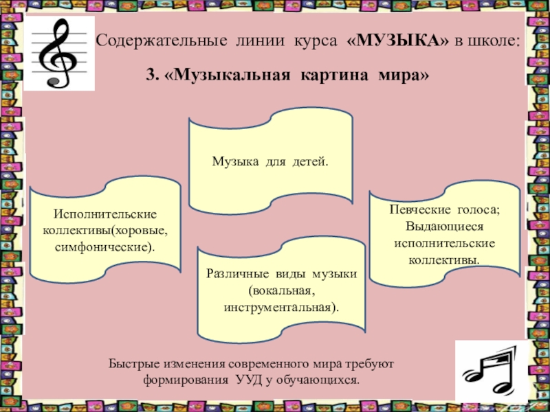 Музыка в школе является одним из основных предметов, обеспечивающих освоение искусства , как духовного наследия, нравственного эталона образа жизни всего человечества, поэтому, в связи с условиями перехода на ФГОС, педагогам-музыкантам необходимо освоить новые категории и понятия, которые составляют «фундаментальное ядро образования» для формирования духовно- богатой, ценностно-ориентированной, личности с активной жизненной позицией.