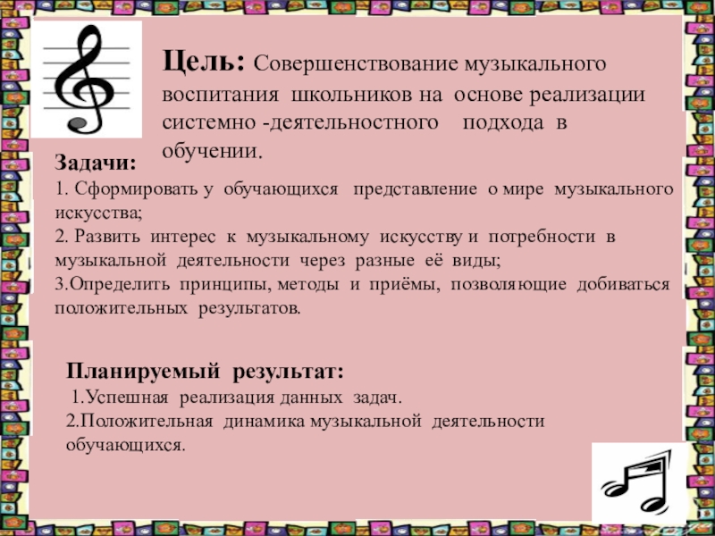 2. Развить интерес к музыкальному искусству и потребности в музыкальной деятельности через разные её виды;