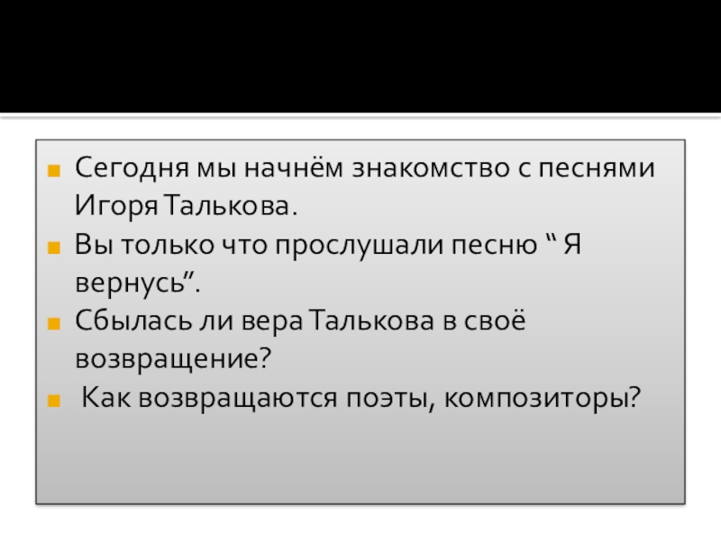 Сегодня мы начнём знакомство с песнями Игоря Талькова. Вы только что прослушали песню “ Я вернусь”. Сбылась