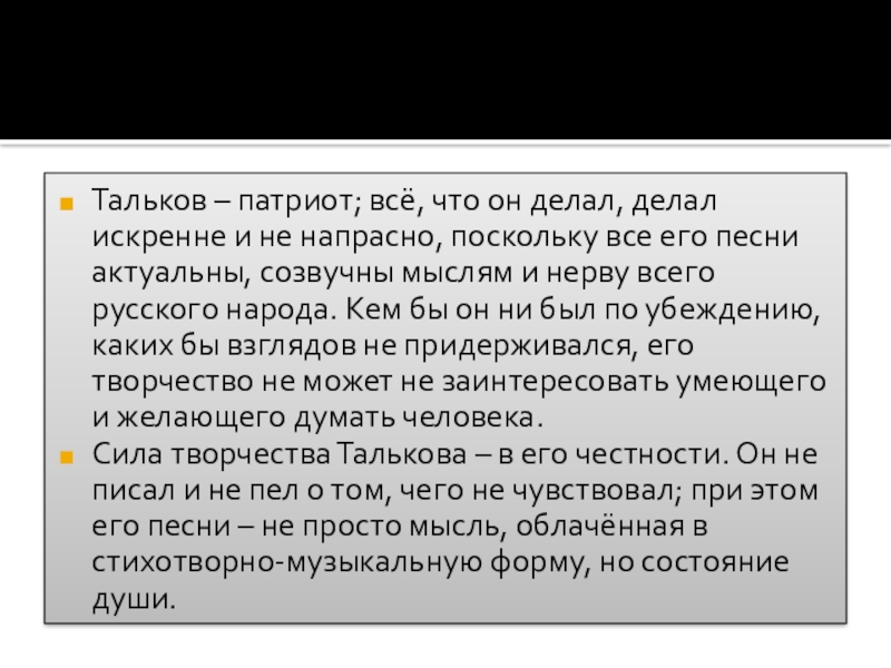 Сила творчества Талькова – в его честности. Он не писал и не пел о том, чего не чувствовал; при этом его песни – не просто мысль, облачённая в стихотворно-музыкальную форму, но состояние души.