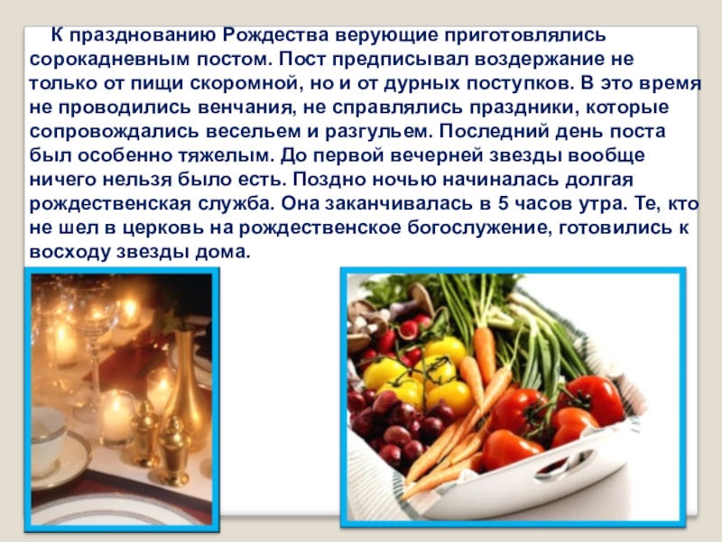 Слайд 2 К празднованию Рождества верующие приготовлялись сорокадневным постом. Пост предписывал