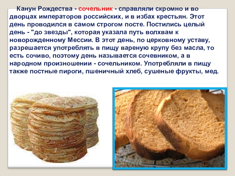 дворцах императоров российских, и в избах крестьян. Этот день проводился в самом строгом посте. Постились целый день - "до звезды", которая указала путь волхвам к новорожденному Мессии. В этот день, по церковному уставу, разрешается употреблять в пищу вареную крупу без масла, то есть сочиво, поэтому день называется сочевником, а в народном произношении - сочельником. Употребляли в пищу также постные пироги, пшеничный хлеб, сушеные фрукты, мед.