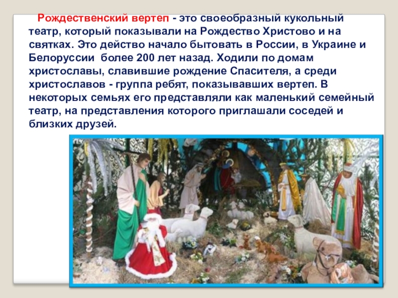 Слайд 10 Рождественский вертеп - это своеобразный кукольный театр, который показывали