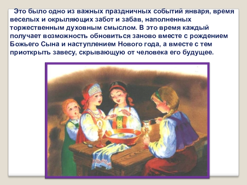 и окрыляющих забот и забав, наполненных торжественным духовным смыслом. В это время каждый получает возможность обновиться заново вместе с рождением Божьего Сына и наступлением Нового года, а вместе с тем приоткрыть завесу, скрывающую от человека его будущее.