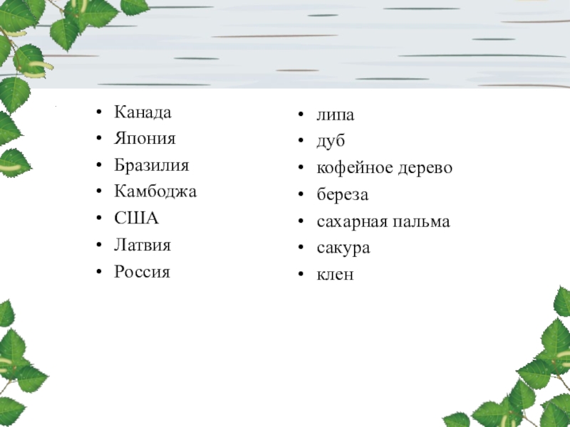 Канада ЯпонияБразилияКамбоджаСШАЛатвияРоссиялипадубкофейное деревоберезасахарная пальмасакураклен