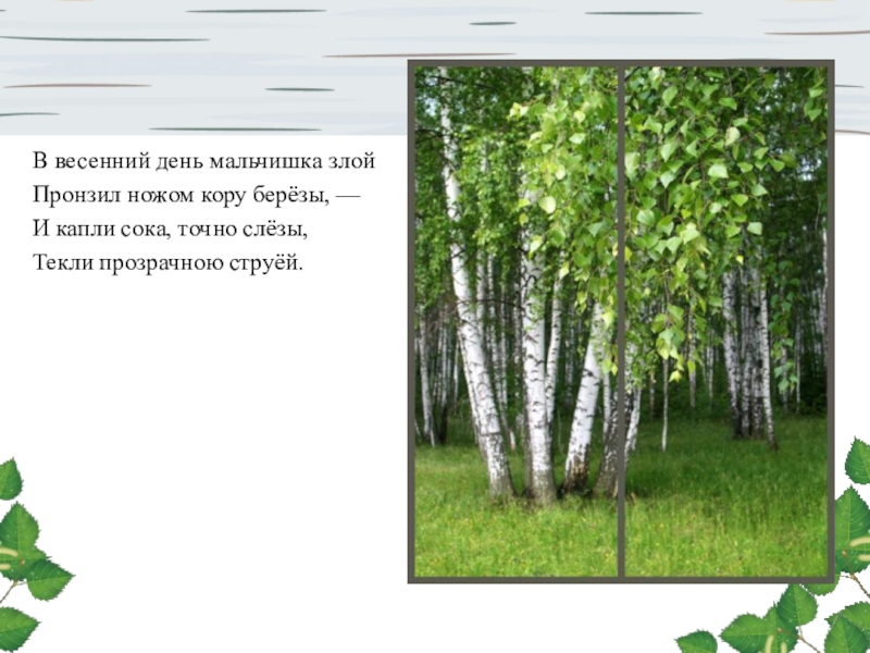 В весенний день мальчишка злой Пронзил ножом кору берёзы, — И капли сока, точно слёзы, Текли прозрачною