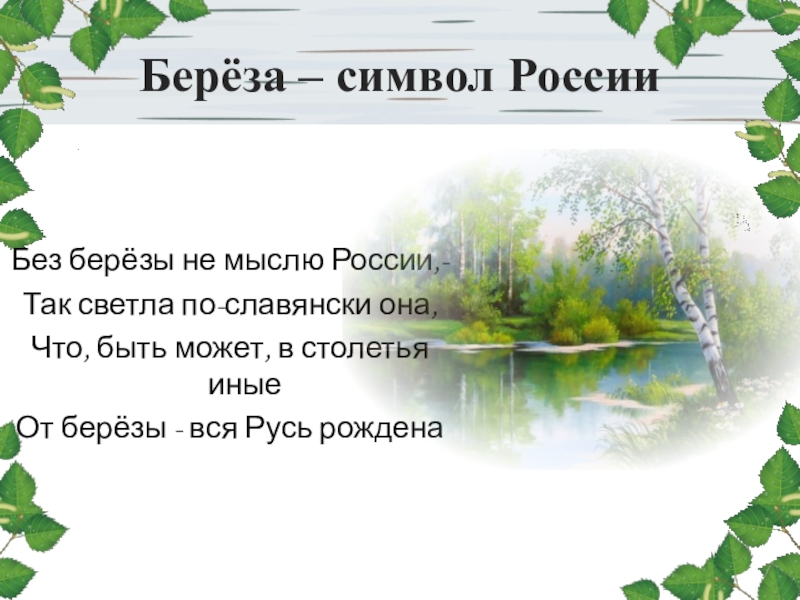Берёза – символ РоссииБез берёзы не мыслю России,-Так светла по-славянски она,Что, быть может, в столетья иныеОт берёзы