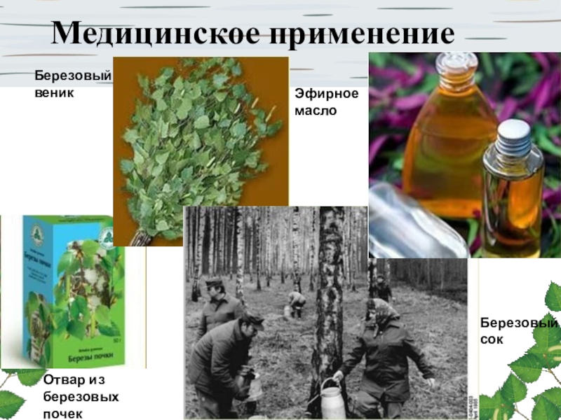 Медицинское применение  Березовый веникБерезовый сокЭфирное маслоОтвар из березовых почек