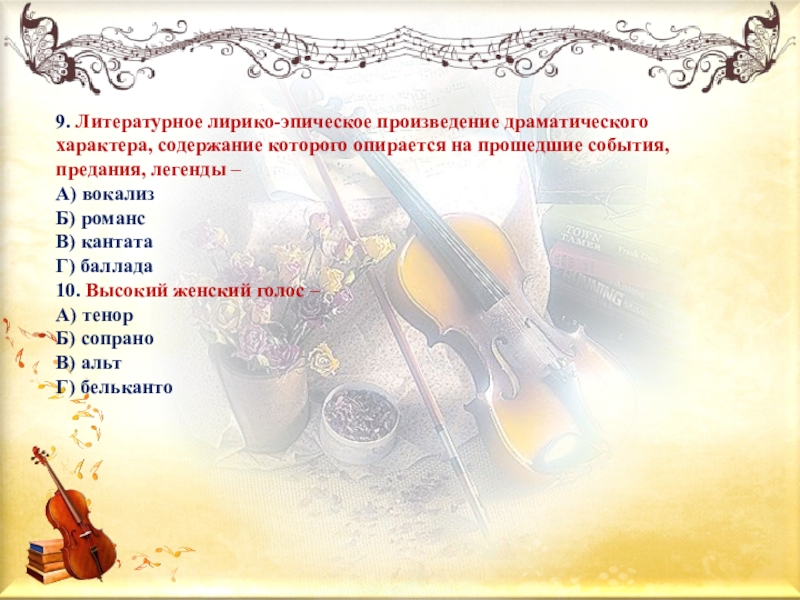 9. Литературное лирико-эпическое произведение драматического характера, содержание которого опирается на прошедшие события, предания, легенды – А) вокализБ)