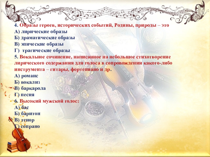 4. Образы героев, исторических событий, Родины, природы – этоА) лирические образыБ) драматические образыВ) эпические образыГ) трагические образы5.