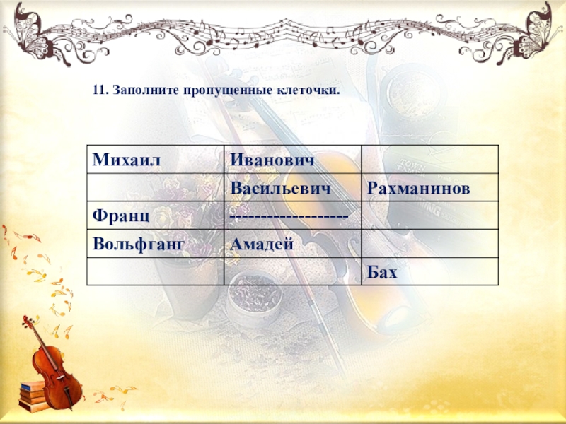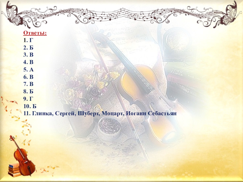 Ответы:1. Г2. Б3. В4. В5. А6. В7. В8. Б9. Г10. Б11. Глинка, Сергей, Шуберт, Моцарт, Иоганн Себастьян