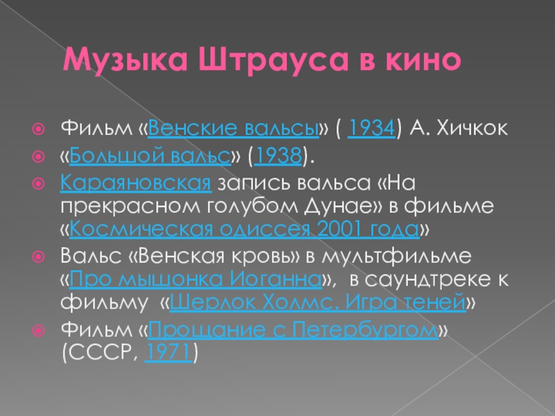 Музыка Штрауса в киноФильм «Венские вальсы» ( 1934) А. Хичкок«Большой вальс» (1938). Караяновская запись вальса «На прекрасном голубом Дунае» в