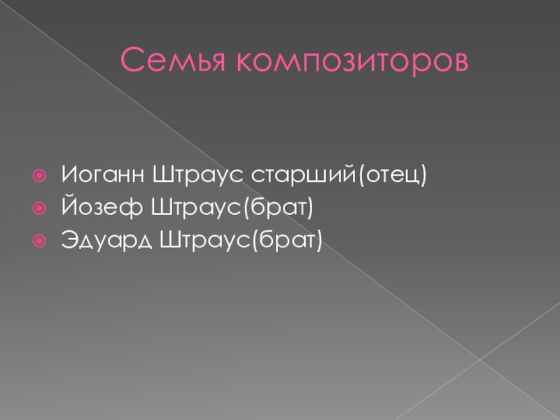 Семья композиторовИоганн Штраус старший(отец)Йозеф Штраус(брат)Эдуард Штраус(брат)